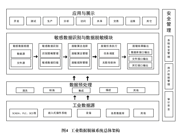 工业数据脱敏系统通过采集SCADA、PLC、DCS、ERP等系统,以及工业主机、数据库等软硬件设备的数据,经过数据清洗、转换等预处理过程,利用敏感数据识别与数据脱敏引擎实现对敏感数据的深度分析和脱敏处理。该系统通过设置脱敏算法选择和脱敏任务执行子模块,可以实现灵活配置的目的。无论是针对已有还是新上的工业数据脱敏业务,该系统都能提供一套合适的数据脱敏方案。