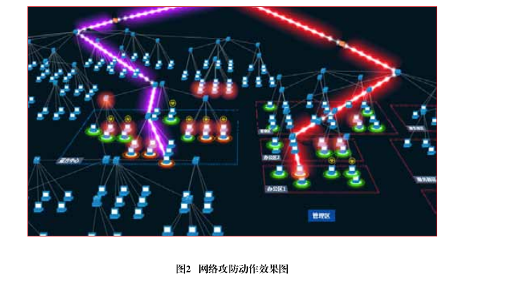 攻防态势可视化利用计算机图形学技术,在某种特定布局结构中使用八叉树、离屏渲染等技术处理场景,将节点对象添加到另一层场景中,按照攻防的动作、关键节点的状态、网络地图结构等信息分层展示攻防动作效果,如图2所示。将网络战场的三维环境通过拓扑结构的构建真实地展现出来,同时为导演方观察整个演训态势提供了参考依据。