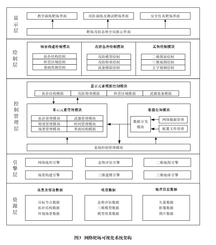 靶场可视化系统采用可视化多引擎架构,通过分层架构的方式,将态势的展示、绘制与控制管理相分离,这样仅需使用一套管理系统,即可满足多引擎获取与展示的调用要求。网络靶场需要满足训练要求的场景是包括网络、硬件、软件以及实践过程中的操作环境。通过这种封装方式,用户不用了解可视化内部显示元素的实现方法,只需通过网络和配置文件接口,即可对靶场攻防态势的显示元素进行编辑,从而快速简便地进行二次开发,如图3所示。