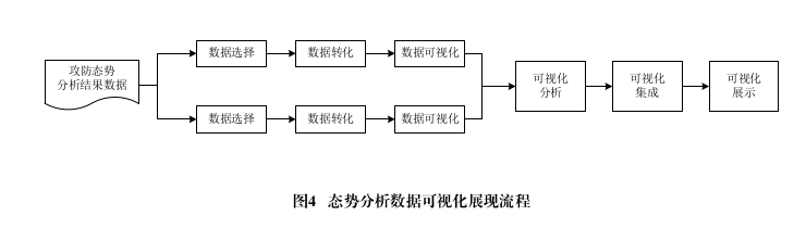 靶场数据的可视化展示利用可视化引擎和集成工具,将多维度、多角度结果进行分析整合,系统在设计时需要考虑直观性、易读性、友好性、突出性和集成性,充分考虑决策者思维,保证重要信息能够突出展示而非面面俱到。按照可视化展示流程,可准确传达、多维分析、综合关联,实现多种分析结果有机结合而非简单堆砌,确保靶场可视化系统的实用性、准确性,如图4所示。