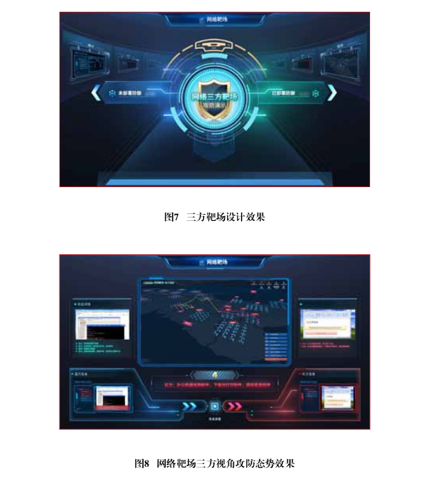 图7展示了三方视角下的网络靶场态势系统的效果,通过分别展现三方视角,支持多屏联动的方式对攻防事件进行态势复现分析。同时主态势界面也能够将多视角内容汇入单屏展示,如图8所示,分别将蓝方的攻击视角、红方的防守视角和导演方的全局视角进行全新的互动结合,丰富了靶场态势信息的展示。