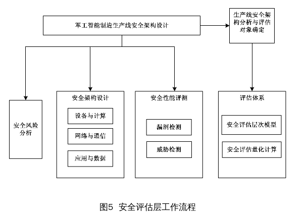 在安全评估层主要采用层次分析法的分层思想,通过分析《工业控制系统信息安全防护指南》《信息安全技术 网络等级保护基本要求》《信息安全技术 网络等级保护测评要求》(等保2.0),以及《涉及国家秘密的信息系统分级保护测评指南》(分保)等相关标准和指南,结合目前工业互联网生产线的业务需求及安全需求,结合工业互联网生产线安全架构的特点,每个因素对应的指标将对应工业互联网生产线安全架构中的各类安全机制,具体在应用中将参照等保2.0、分保等标准和指南中的规范,结合“工业互联网漏洞挖掘分析及威胁辨识”等方法和技术对工业互联网生产线进行漏洞挖掘分析和威胁辨识检测,并利用所建立的漏洞库和威胁模型对漏洞和威胁进行定性和定量分析,得到指标层及其打分依据。