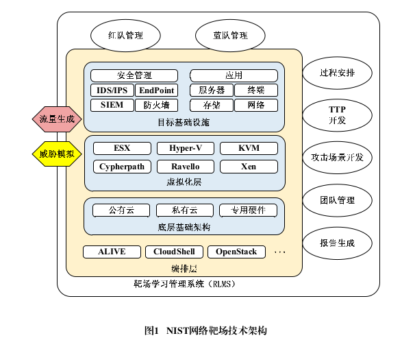 2020年6月,美国国家标准与技术研究院(NIST)发布《网络靶场指南》,围绕网络安全教育、认证和培训等领域,给出了一种网络靶场的技术框架,如图1所示。该技术框架基于靶场学习管理系统(RLMS),将网络靶场划分为编排层、底层基础架构层、虚拟化层和目标基础设施层4个层次[2]。