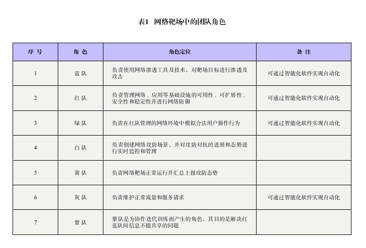 网络靶场系统中一般会包含若干团队,每个团队在靶场中都具有自己的角色定位。到目前为止,网络靶场已经发展到了7种不同的团队角色,如表1所示。各种团队角色有不同的角色定位,有些角色还可以由智能化软件实现自动化,代替真实的人来完成相应的角色功能。