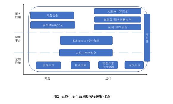 针对云原生环境下容器基础设施、编排平台、网络、云原生应用层面存在的风险,结合云安全防护思路,在对应层面建立安全防护机制,形成全生命周期的安全防护体系,如图2所示。
