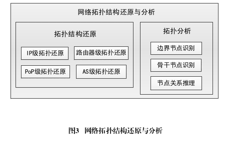 网络拓扑结构还原是利用IP路径信息、路由器配置文件、BGP路由表等数据还原得到网络的IP级、路由器级、PoP级和AS级的拓扑结构,旨在识别网络关键节点、推断节点间的隐含关系,发现拓扑结构的薄弱环节,如图3所示。