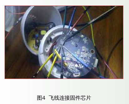 第一类,编程器读取法。通过飞线将固件芯片管脚接出,如图4所示,连接好固件芯片的管脚,通过夹具连接芯片到编程器,再通过专用编程器软件,对该芯片进行读取。除飞线外,也可以将固件芯片拆除后直接放到编程器读取。