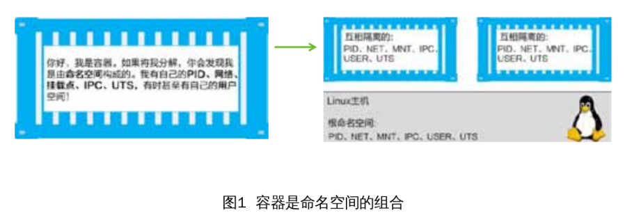 ◎命名空间(Namespace):本质上容器是由各种命名空间组成的,它们为容器提供了基础隔离,让每个容器拥有独立的进程ID、网络栈、根目录、内存、用户名和主机名,如图1所示。