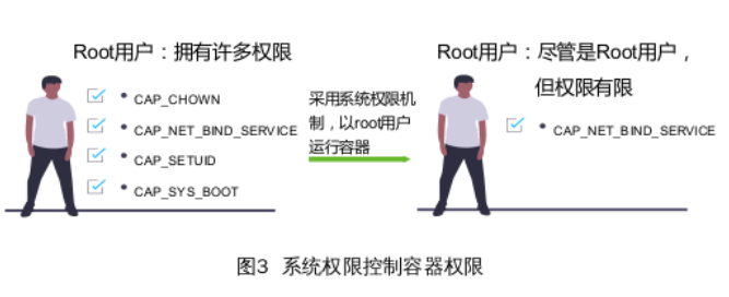 ◎系统权限(Capability):root用户拥有全部的权限,以root身份运行容器很危险;但如果以非root身份在后台运行容器的话,由于缺少权限会处处受限,系统权限机制可以提供细粒度的权限访问控制,控制容器运行所需的root用户权限,即使攻击者取得了root权限,也不能获得主机的较高权限,将会限制进一步的破坏,如图3所示。