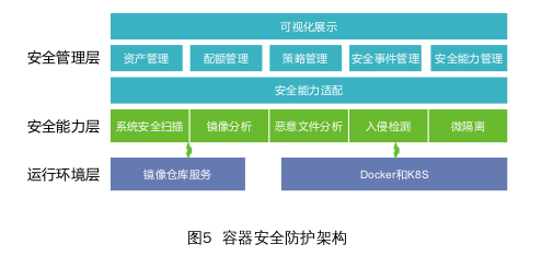 ◎安全能力层:负责提供具体安全能力,为容器环境提供安全保护,安全能力涉及系统安全扫描、镜像文件分析、恶意文件分析、入侵检测和微隔离等。